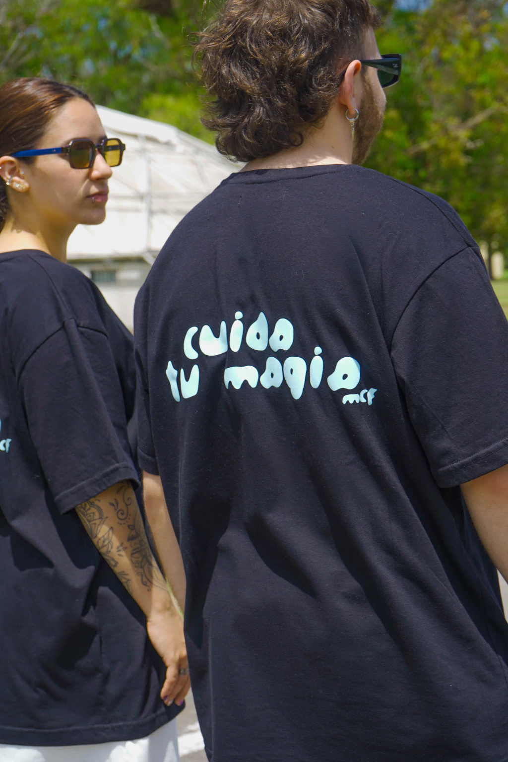 dice "cuida tu magia" adelante en el centro y atras grande en su espalda.