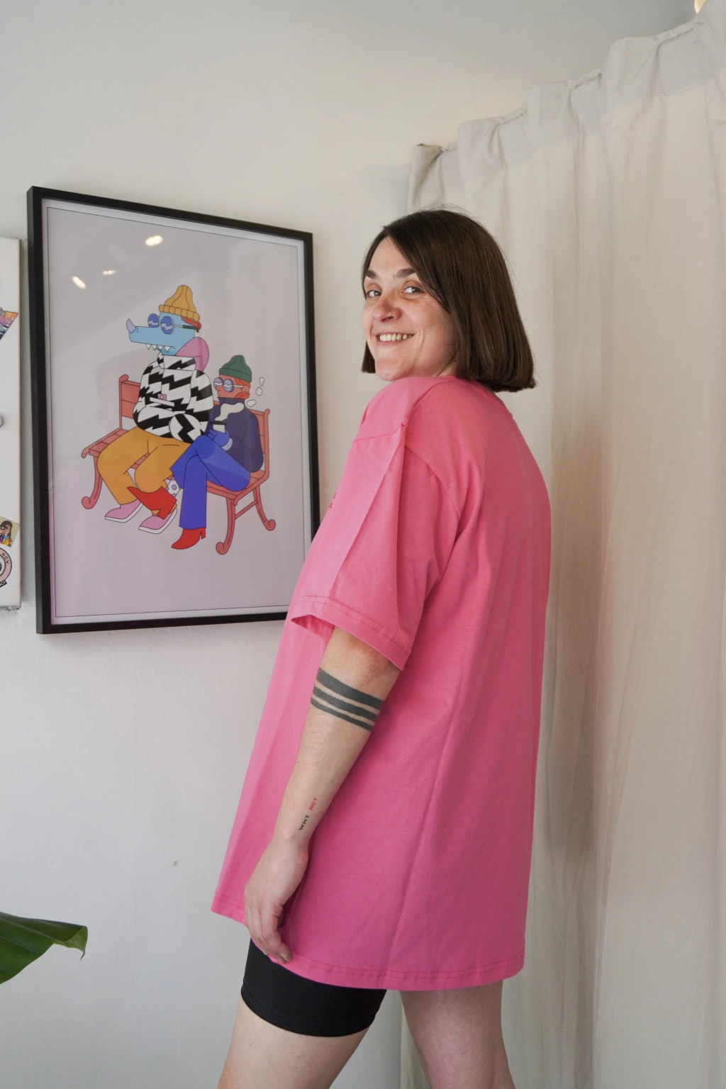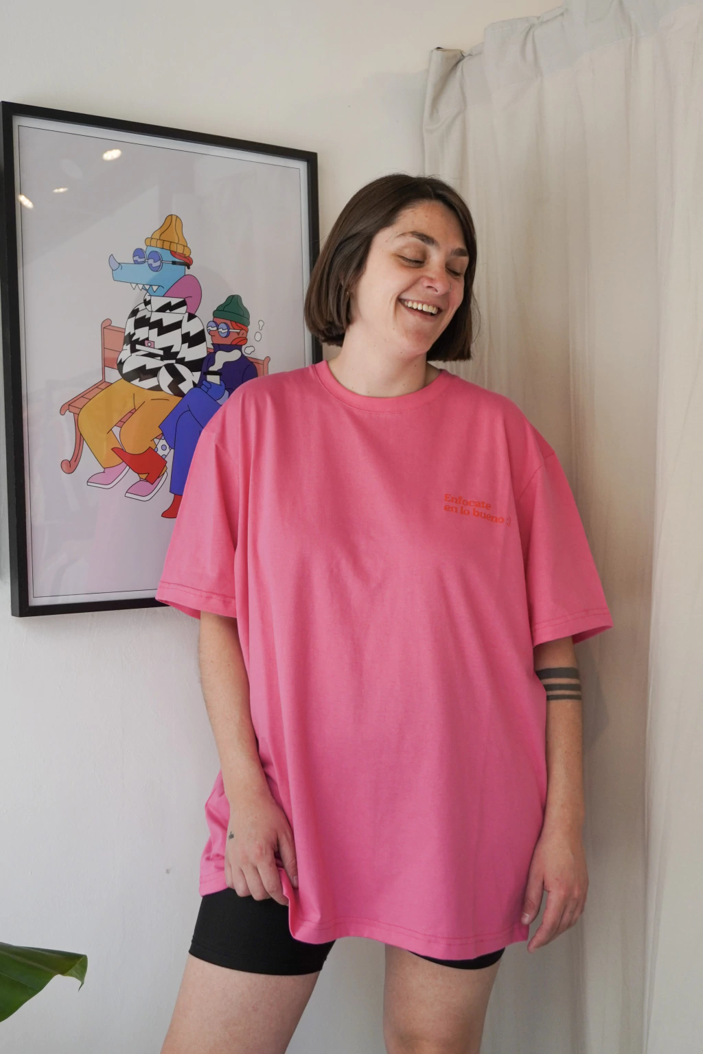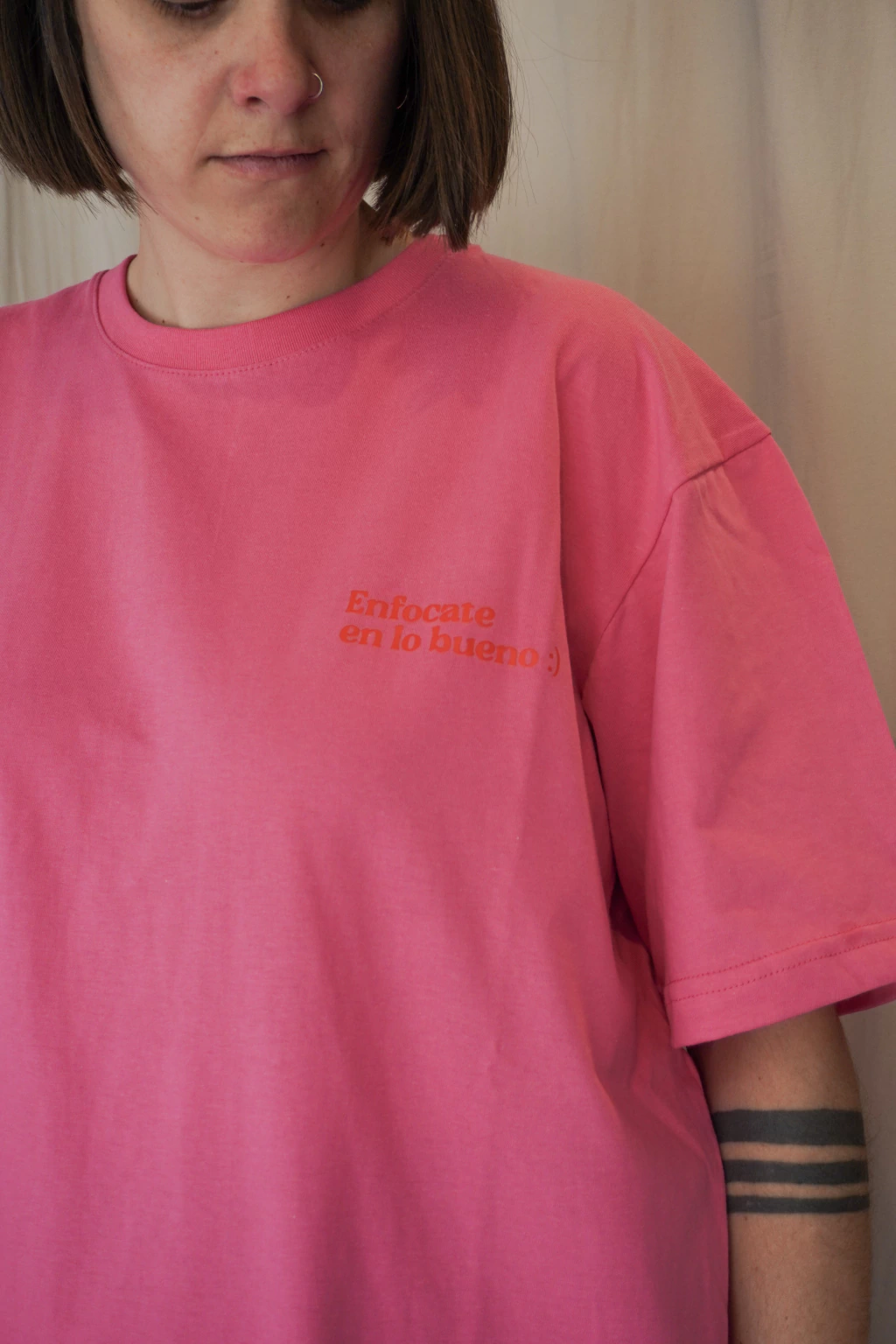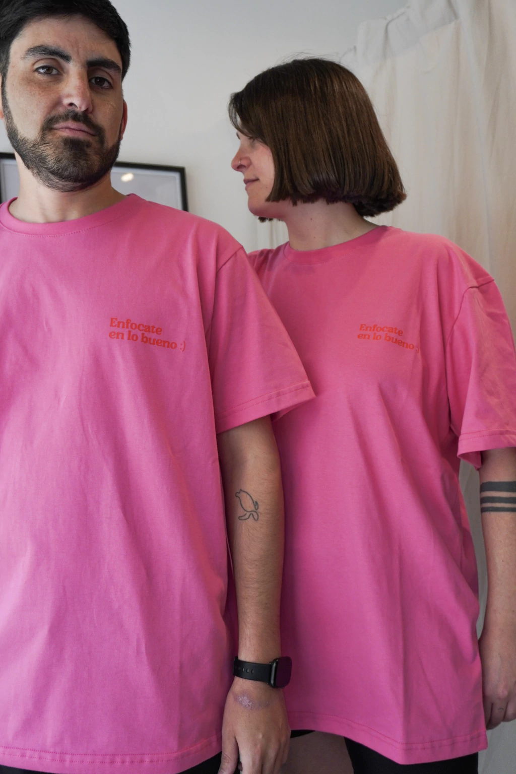 Remera 100% algodón, en color rosa con estampa de dtf en color rojo.